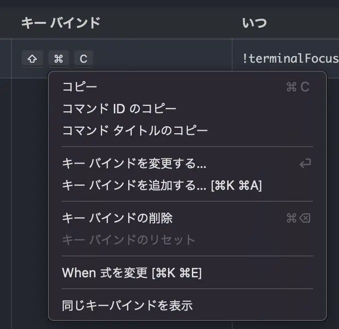 Visual Studio Codeで「shift」「command」「c」の3つのキーを同時に押すと、ターミナルが起動します。「shift」「command」「c」の3つのキーを同時に押したときには、AlfredのClipboard Historyを表示したいので、Visual Studio Code側のキーボードショートカットを無効にしました。